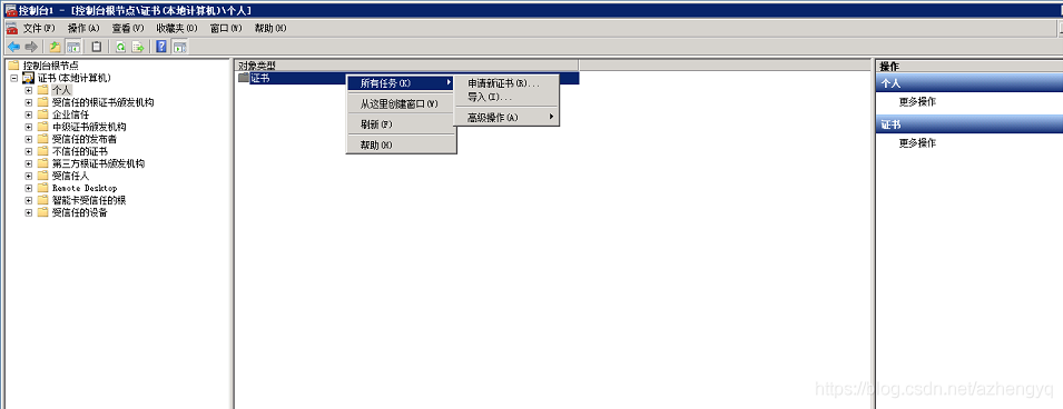 开始 -〉运行 -〉MMC,启动控制台程序 -> 选择菜单“文件 -〉添加/删除管理单元”->列表中选择“证书”->点击“添加”-> 选择“计算机帐户” ->点击完成。在控制台的左侧显示证书树形列表,选择“个人”- “证书”,右键单击,选择“所有任务-〉导入”, 根据“证书导入向导”的提示,将.pfx 格式文件导入“根据证书内容自动选择存储区”。(注意导入过程中需要输入密码)导入成功后,可以看到如图 2 所示