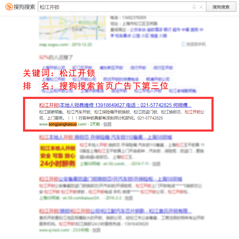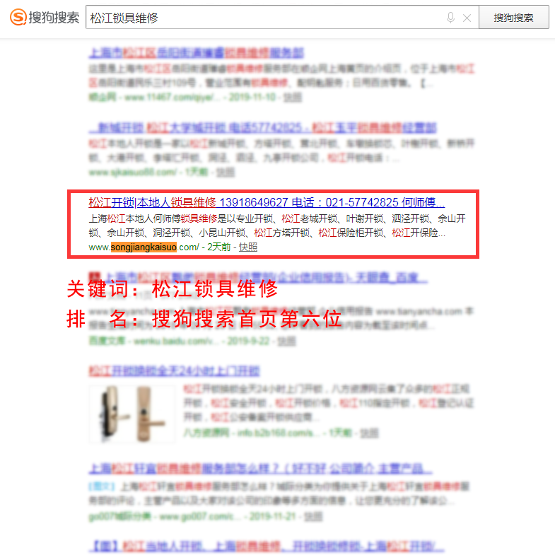 该优化案例在百度搜索首页,搜狗搜索首页,均有多个关键词排名靠前