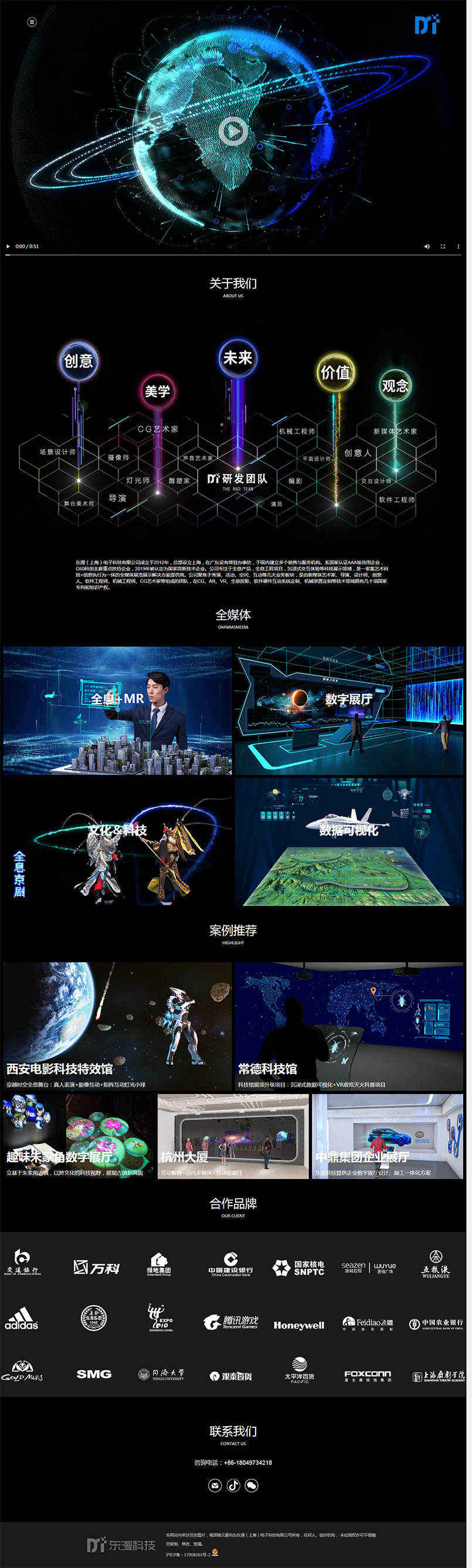 东漫(上海)电子科技有限公司成立于2012年,总部设立上海,在广东设有常驻办事处,于国内建立多个销售与服务机构。系国家认证AAA级信用企业,G60科创走廊重点扶持企业,2019年被认定为国家高新技术企业。公司专注于全息产品,全息工程项目,沉浸式交互体验等科技展示领域,是一家集艺术科技+创意执行为一体的全媒体展览展示解决方案提供商。公司聚焦于秀演、活动、空间、互动等几大业务板块,是由新媒体艺术家、导演、设计师、创意人、软件工程师、机械工程师、CG艺术家等组成的团队,在CG、AR、VR、全息投影、软件硬件互动系统定制、机械装置定制等技术领域拥有几十项国家专利和知识产权。